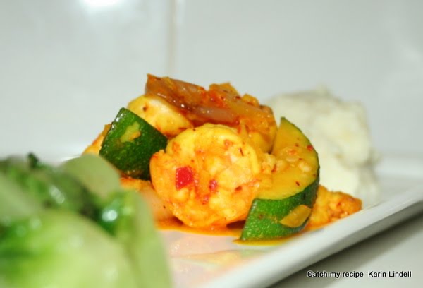Jag har en gasspis och anvande en wok men stekpanna funkar också. Hetta upp olja och bryn löken lätt, lägg i räkorna, saffran, vitlöken och chilin. Bryn tills räkorna inte är råa. Squashen är godast krispiga så lägg i dom sist. Krydda med sweet chili, salt och peppar.Då var det bara att lägga upp. Jag tycker det är kul att lägga upp på tallrikar men funkar ochså att servera på bordet i skålar.